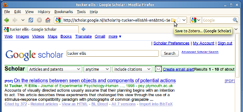 In this post I will focus on Zotero, which is a free and open source reference manager. I have used Zotero on a daily basis for almost two years now and I have grown to depend on it. Zotero is not a standalone program, but it consists of two plugins for the Firefox internet browser. The first plugin is the actual reference manager. The second plugin provides integration with your word processor. Open Office and Microsoft Word are supported. Once you have installed Zotero and do a search on Google Scholar (this also works on most other scientific websites) a small icon appears in your navigation bar (Figure 1). If you click this item, a dialog pops up, which asks you to select the item that you want to import into Zotero (Figure 2).